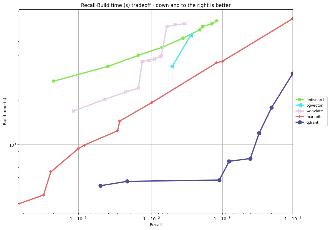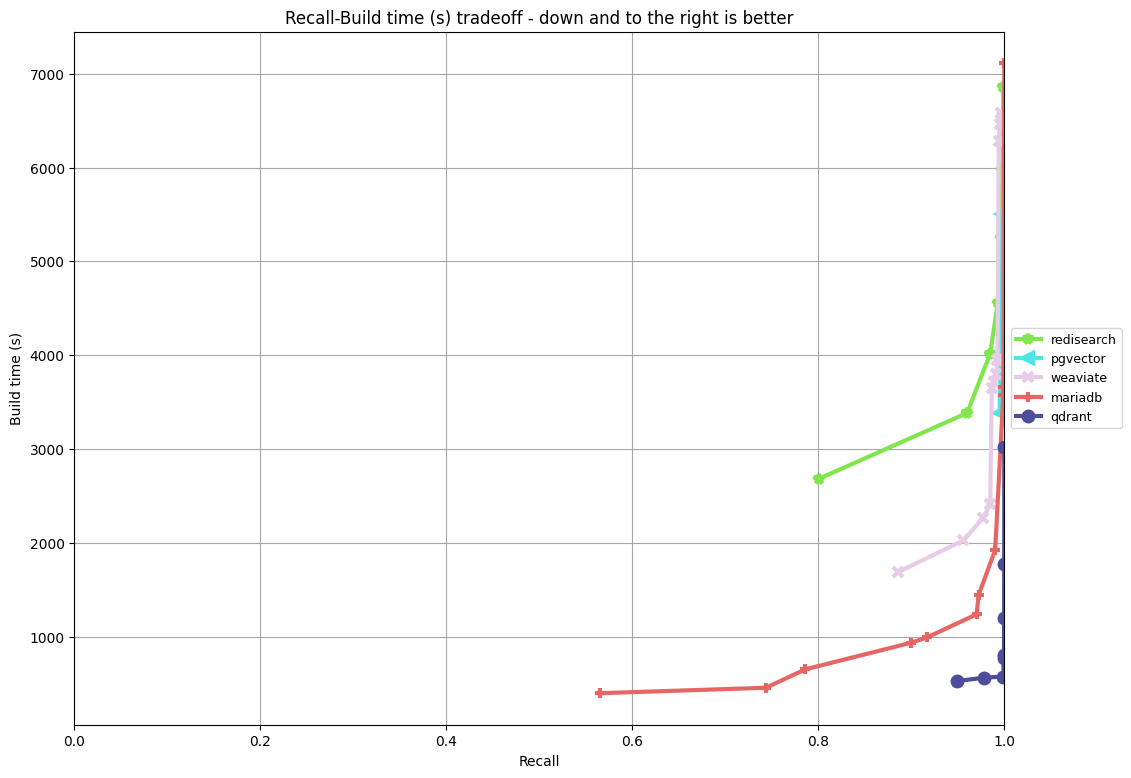MariaDB Vector shows a very competitive performance. It demonstrates the highest qps for a given recall on smaller datasets, with RediSearch being the second, and on large datasets MariaDB Vector comes a close second after RediSearch. On the other hand, MariaDB Vector builds an index faster than RediSearch. Interestingly enough, specialized single-purpose vector databases didn’t turn out to be much faster. They search worse than both MariaDB Vector and RediSearch. And except for Qdrant on the GIST dataset the indexing time isn’t better either.