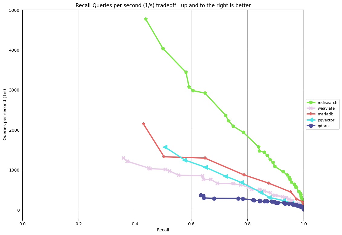 Concurrency results are baffling. It’s hard to imagine that all tested databases are that bad at scaling. I’d rather shrug it off as some bug in the corresponding python module for a specific database. On the other hand, it’s almost as difficult to believe that they all, except for MariaDB, have this bug in their python modules. Perhaps, developers familiar with these databases could take a look at ann-benchmarks batch mode and explain the bad scalability results. One is clear, though, MariaDB Vector scales nicely and many concurrent connections can search the vector index in parallel significantly improving the throughput.